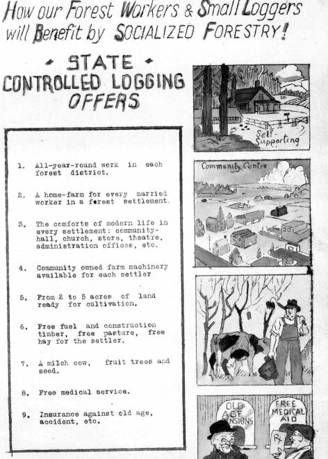 The socialist Cooperative Commonwealth Federation (CCF) had a radically different vision for BC’s forest industry. Their goal was to “eradicate capitalism and put into operation the full programme of socialized planning.” This was Tommy Douglas’ party, the reason we have universal healthcare, and they came within spitting distance of forming government in BC.