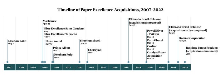 But Wijaya was just getting started. His most recent rise in the pulp industry can only be described as meteoric. In three years, he bought Catalyst Paper (2019), Domtar (2021), and Resolute Forest Products (2022) - making him the largest private forest manager in Canada. With permission from every level of government, he now owns dozens of mills and controls over 22 million hectares of Canadian forest, an area seven times the size of Vancouver Island.